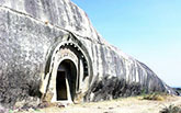 スダーマ窟のファサードと、ゴピー窟の入口に刻まれた碑文 インド最古の石窟寺院は、東インドの バラーバル丘にある。ここには 30m×150m ほどの巨大な岩が ゴロンと転がるように横たわり、ここに4窟が彫られた。 壁に残る碑文によれば、紀元前 250年と 257年に マウリヤ朝のアショーカ王が アージーヴィカ教の僧のために、雨季の修道所として造営させたという。仏教の保護者として名高い アショーカ王も、この頃は アージーヴィカ教に肩入れをしていた。