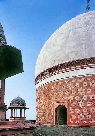 アクバル帝時代の建物らしく 赤砂岩と組み合わせられているが、ドーム屋根はすべて白大理石。