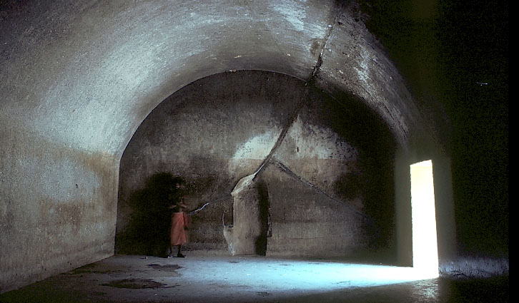 スダーマ窟の内部 (平面図のB室)。 天井は半円筒形のヴォールトで、壁ともども「本磨き」仕上げとなっている。 正面の壁にアーチ状のニッチがあるのは、ここに何かを飾ったのか、 あるいはこの奥に彫るつもりだったもう一室への入口だったかもしれない。 天井から壁にかけて 大きな亀裂が走っているのは、地震によるものであろう。