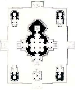 クメール的変容の代表はアンコール・ワットで、ここでは神王(デーヴァラージャ)思想による 王廟と寺院の一体化が行われ、インドのヒンドゥ寺院には見られない巨大な境内が マンダラ図形のように構成された。それを可能にさせたのはジャイナ教寺院で発展した、四方に開かれた四面堂形式の伝播である。この四面堂としてのガルバグリハには ヴィシュヌ神が祀られていたらしい。ここの塔状部は砲弾形の輪郭をした北方型に 原型をもつと考えられよう。