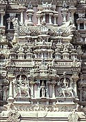 ここには南方型の彩り豊かなドラヴィダ様式の寺院ユニットが緻密につくられている。こうしたヴォールト屋根の2階建ての寺院形(シャーラー)が水平層全体に建ち並んでいて、その上の各層もすべて同様である。写真の上部に第3層目の寺院形の下部が見えるが、その軸線が 2層目とずれているのは、上層階がセットバックして少しずつ縮小形となるからである。