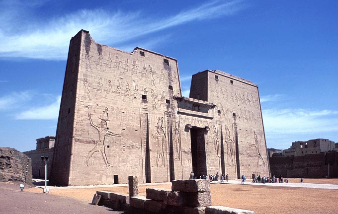 The Temple of Horus, 237-57 B.C.E. in the Ptolemaic period, Edfu, Egypt. The well preserved twin Pylon towers remind us of Gopuras (temple gates) in southern India.