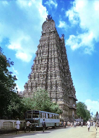 The North Gopura of the Minakshi-Sundareshvara Temple, Madurai, Tamil Nadu. The Gopuras are repainted colorfully every 15 or 20 years.