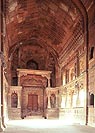 神谷 西インド、ラージャスターン州のラーナクプルに、アーディナータ寺院 というすばらしいジャイナ教の寺院があります。インド建築の最高傑作と僕は言っています。 佐藤 私も行きましたが、その彫刻は実にすばらしいですね。 神谷 このアーディナータ寺院は大規模で、高く低く、ドーム屋根があちこちにたくさんかかっているんです。そのなかに未完成のドームもありましてね。天井の中心から細かく彫刻されたハスの花の列が螺旋(らせん)形を描いて下りてくるドーム天井なんです。 白大理石で造られています。ところが、中央から始まった彫刻が途中でパタッと止まっているんです。なぜか、わかりませんが ・・・・。 それを見て、僕ははじめてインドの伝統建築の建て方がわかりました。つまり、まず石工が石を粗く刻み、それで全体を組み立ててしまう。組んだあとで彫刻家が乗りこんできて彫っていくわけです。 水島 建築家と彫刻家とは分離しているわけですか。 神谷 全体を統制していなければ建築家といえないわけです。はじめは石工たちが粗く刻んだ石を組み立てて全体をまず造ってしまい、そのあと彫刻家が神像や象やハスの花などを細かく彫っていく。 佐藤 そうすると、石を切り出す人とそれを粗く刻む石工とは違うわけですか。史料には石工と出てきますが、その区別がつきませんね。 水島 インドらしく、分業が細かくなっているから、あるいは違うかもしれませんね。 神谷 日本人は絵画が好きですが、インド人が一番好きな造形芸術は彫刻なんですね。ですから、壁面を全部彫刻で飾るように、建物自体も彫刻のように造ろうとする。内部空間はすばらしいけれど外側からは外観の姿が見えないアラブ型やペルシア型のイスラム建築が伝えられても、インド人にとっては面白くない。それで、インドの伝統的な美学をとりいれ、イスラムの中庭を囲む内向きの建物から、外向きにかっこうよく見せる彫刻的な建物に変えていくわけです。 中里 それはよくわかる気がします。もうひとつ、インド・イスラム建築の特色として、廟建築が主流になったと言えますか。 神谷 言えます。 佐藤 廟建築と言えば、サンスクリットのチャトラ(傘)と同じことばの チャトリ という、廟や城を飾る小さな建物がありますね。チャトリはイスラム建築との関係ではどういう位置を占めているんですか。 神谷 インド人の美学ではやはり、柱・梁の建物が好きなんです。だから、四本柱を立てて梁を渡し、真ん中にドーム屋根をかけ、周りに板廂(いたびさし)を石で出すというチャトリ形式を生みだした。それをまた、めったやたらと飾りにつかっています(笑)。チャトリのあるイスラム建築は、イスラム圏広しといえどもインドにしかないわけで、インドの伝統がみごとに表れていますね(笑)。 水島 さきほど、建築家の名前が残っているとのお話でしたが、どこの建物ですか。 神谷 ラーナクプルのアーディナータ寺院です。デパーカという建築家が設計したとの碑文が残っていますし、400本ぐらい立っている 彫刻のある柱の一本の真ん中には、デパーカの像 が刻まれているんです。 これは本当に珍しいことなんです。宗教的なものを造るのは神様であって、人間は神の代理人か手下にすぎないということがアジアでは基本的な考え方になっていますから。 水島 南インドの建築と北インドの建築とを比べてみて、根本的な違いというものはありますか。 神谷 中世のヒンドゥ寺院は基本的に南方型と北方型とに分けられるように、スタイルが違います。僕は南インドの建築で不思議でならないことがあるんです。それは、チョーラ王朝時代には、タンジャーヴール やガンガイコンダチョーラプラムの大寺院のように本堂 ― ヴィマーナ ― がどんどん大きく飾りたてられていく。ところがチョーラ王朝が滅びて、ヴィジャヤナガルの時代になると、その動きは止まってしまう。 本堂を目立たせない。むしろ古いものをそのままにしておいて、その周りに大きなゴプラ ― 境内を囲む塀の四方に設けられた高大な楼門 ― が造られていく。 こういう方向転換がなぜもたらされたのか、よくわかりませんね。社会の根本的なメンタリティの転換が南インドにあったのでしょうか? 水島 そう、たしかにヴィジャヤナガル時代になるとゴプラが大きくなって、中心部分が目立たなくなりますが、その転換がどうしてなされたのか、私はよくわかりませんね。