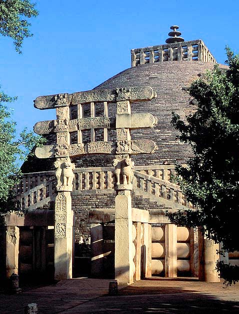 An example of Buddhist architecture in India: Stupa 1 (Great Stupa) and its western Torana at Sanchi, Madhya Pradesh, 1st century.