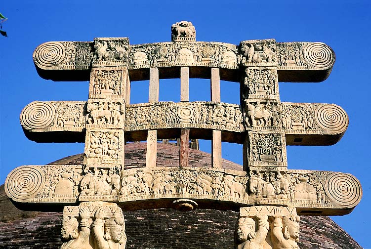 第 1ストゥーパの西トラナ詳細、サーンチー 彫刻はよく残っているが、上下6本の束柱は失われて、新しい石に置き換えられている。 他のトラナと同じように、梁(貫)の両端部が 渦巻き状になっているのが 印象的 2本の柱の頂部には、あたかも上部を支えているかのように、侏儒(矮人)が刻まれている。
