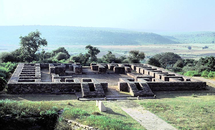 典型的な中庭型プランの僧院 No.51、サーンチー、7世紀 約 33m角の正方形で、入口から中庭を隔てた正面に仏堂、周囲に 22の僧室を並べる。 興味深いことには、通常と逆に、石造壁の表面を焼成レンガで仕上げている。