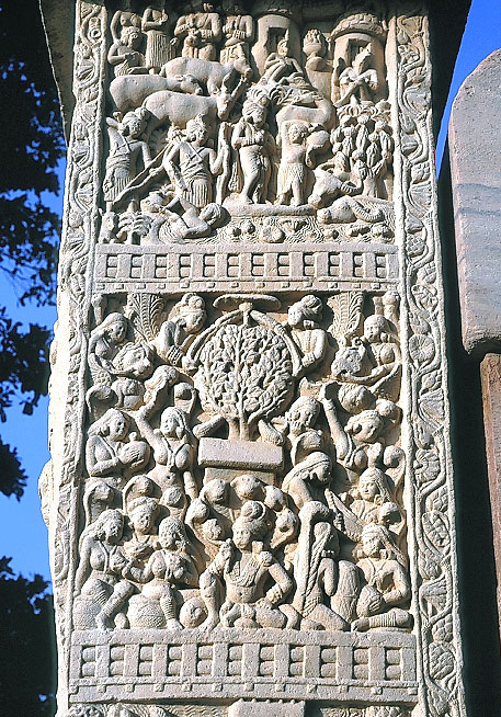 第 1ストゥーパの西トラナにおける、北柱のレリーフ彫刻(南面の最上段と 2段目)。 上は ブッダの前世譚「サーマ・ジャータカ」、下は蛇王の 「ナーガ・ムチャリンダ」。 仏像のなかった時代、ブッダの姿は 傘蓋を戴く菩提樹として描かれ、人々に礼拝されている。