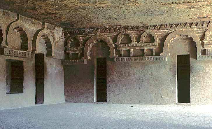 前期のヴィハーラ窟 (第 12窟) の内部には 柱がない。 前 2世紀後半、アジャンター 各僧室の入口上にはチャイティヤ・アーチが彫刻され、壁面も小アーチで装飾されている。 しかし小乗期なので、一切仏像は彫刻されてない。
