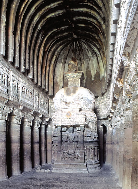 第 26窟(チャイティヤ窟)の内部、5世紀末、アジャンター(インド)
