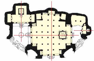 この破調の原因が何であったのかはよくわからない。西寄りの聖室も四方に開口部をもち、それぞれが一対のドゥヴァーラパーラ(護衛神)によって守られている。この東西軸上の東側入り口が立派に作られているところをみると、本来は東側が正面で、北側入り口は後からつくられたのかもしれない。 東の中庭も岩山を掘った人工的な中庭であり、これに面する東院は、小規模ながら均整のとれたつくりをしている。一方、西の中庭に面する祠堂はごく小さく、かたわらには池が設けられている。
