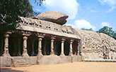 7世紀にさかのぼる昔日、今は小さな村にすぎないマハーバリプラムも、当時はコロマンデル海岸で最も重要な海港都市であった。そこでは日暮れになっても、石工たちのふるう金槌や鑿(のみ)の音がたえず響きわたっていた。彼らは海岸から 400メートルほどのところに横たわる細長い岩山で、何十年にもわたって岩を彫りつづけていたのである。硬い花崗岩の岩山の表面には古い説話を描く巨大な岩壁彫刻がつくられ、岩山の周囲には 10を超える石窟寺院が掘削された。石窟寺院にはライオン柱が立ち、内部にはガルバグリハ(聖室)が掘られ、その手前のマンダパ(拝堂)の壁には、パッラヴァ朝美術を代表する数々の壁面彫刻が制作された。