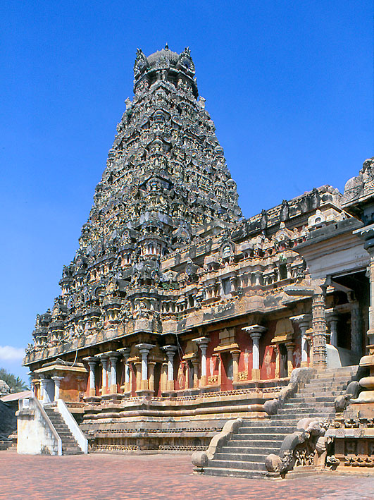 チョーラ朝による最後の大寺院、カンパハレーシュワラ寺院、13世紀初め、トリブヴァナム。 タンジャーヴールの寺院形式を踏襲してクロットゥンガ3世(在 1178-1218)が造営した。 高さ 38mのヴィマーナは直線的に伸びあがり、ゴプラよりも本殿が偉大であった最後の作例である。しかしながら神像で埋め尽くされたヴィマーナの壁面は、後の大ゴプラの壁面構成と同様で、 彫刻の力強さも衰えている。(なぜか、これは ユネスコ世界遺産には含まれていない)