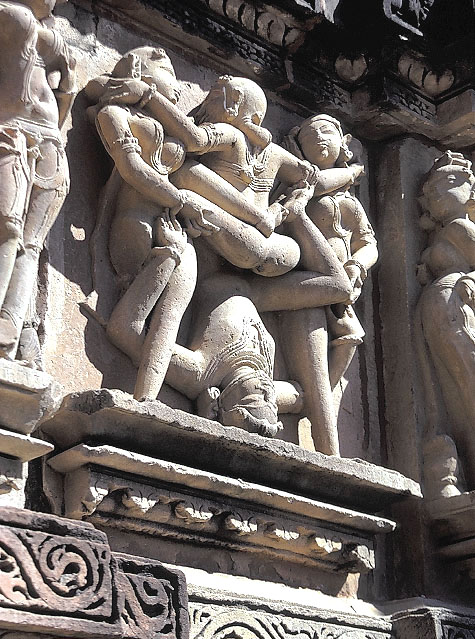 古代の聖 典『カーマスートラ に基づいて、男女のアクロバティックな性交体位が彫刻されている。