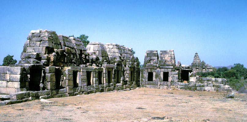 チャウンサト・ヨーギニー寺院、カジュラーホ、900年頃。 本来は、カーリー女神の従者のヨーギニーを祀る 64の小祠堂が 中庭を囲んでいた。 現在は約半数のみが残る。 遠くに見えるのはカンダーリヤ・マハーデーヴァ寺院。
