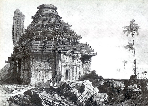 19世紀前半におけるスーリヤ寺院の状態。 ファーガスンの原画によるリトグラフ。 レカー・デウルの塔状部が、ジャガモハンの背後に まだ一部残っていた。 (From "Picturesque Illustrations of the Architecture of Hindustan" by James Fergusson, 1889)