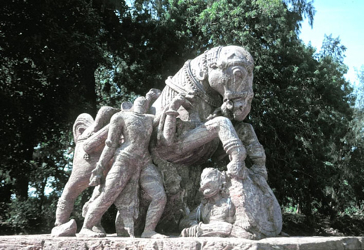 スーリヤ寺院の境内の彫刻のうち、戦士と馬の像、コナーラク。