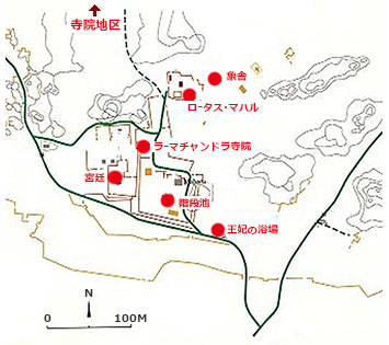 城壁で厳重に守られた宮廷地区には、「王の基壇」をはじめ王妃の浴場や象舎、ゼナーナとよばれる後宮などがあった。堂々たる王の基壇は、さまざまな儀式やマハーナヴァミの祭礼に用いられたものと思われる。基壇の壁面には豊富な帯状のレリーフ彫刻がほどこされ、狩の場面や楽人の行列、馬や象のほかにラクダまでも彫り出された。
