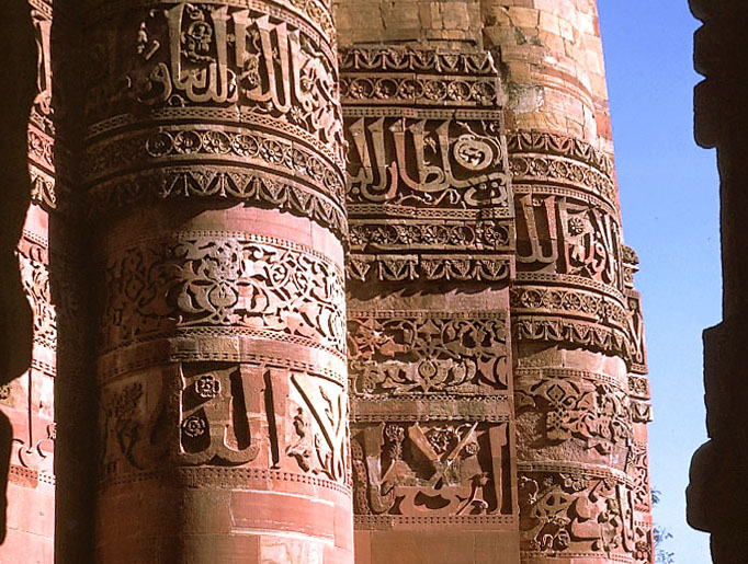 クトゥブ・ミナールの壁面彫刻、唐草模様とカリグラフィーの帯。13世紀。