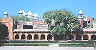 公謁殿(ディーワーニ・アーム) 寝殿(ハース・マハル)とアングリー庭園 現在のアーグラ城にアクバル帝の足跡はあまり多くない。彼の孫にあたる第 5代皇帝のシャー・ジャハ−ンが、アクバル時代の建物の多くを取り壊し、改築したためである。木造だったディーワーニ・アーム(公謁殿)は白大理石による三廊式の列柱ホールとなり、その広い前庭を囲む柱廊も石で置き換えられた。この前庭は宮廷地区と、デリー門からの市街と、そして大モスクとを結ぶ広場でもあって、皇帝はここで市民の訴えを聞き、裁きを下したのである。高さ7メートルの花弁形の大アーチが9連もつづくファサードは圧巻であり、中央の奥には一段高い玉座が設けられている。