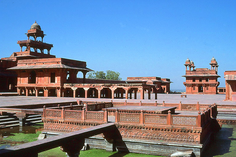 宮廷地区のアーヌープ・タラーオ(池)、左手に五層閣、右奥に公謁殿が見える。ファテプル・シークリー