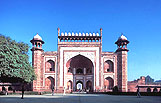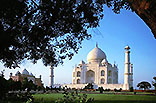 タージ・マハルとは ムムターズ・マハルの名前が縮められたもので、「宮廷の冠」をも意味した。シャー・ジャハーン帝の ため息が石化したと形容される この廟は、宮廷のあるアーグラ城にほど近い ヤムナー川の右岸に建っている。左右対称で 均整のとれたムガル建築の伝統を引き継いで、それを絶頂にまで高めた廟建築である。敷地の広さは 17ヘクタールにおよび、その広大な四分庭園(しぶていえん)の中央の池に姿を映す廟は 幻想的に美しい。