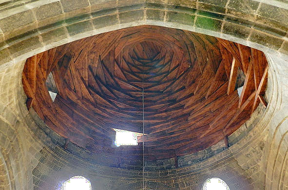 エルズルムのウル・ジャーミ、木造ラテルネンデッケ天井、トルコ 梁状ではなく、面状の小片を各コーナーに積み重ねると、全体がドームに近くなる。 しかし 各三角板は あくまでも水平に置かれているので、真のドームではない、 持ち出し構造の「疑似ドーム」である。