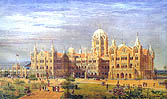 「インド・サラセン様式」という奇妙な名称は、英国の一方的なヨーロッパ文化の押しつけが インド大反乱を招いたという反省から、インドの伝統文化を尊重する気運が高まり、ムガル朝のイスラーム建築(当時は サラセン建築と呼ばれた)の要素を取り入れたコロニアル建築を、そう呼ぶようになったのである。チザムはさらに、ヒンドゥ寺院や 南インドの木造建築の伝統までをも咀嚼(そしゃく)して、独自のデザインを作り上げた才気あふれる優秀な建築家であった。しかしスティーヴンスとの闘いに敗れ、彼の作品は ボンベイには一つも残っていない。 スティーヴンスの建てた行政庁舎によって、ヴィクトリアン・ゴチックのボンベイの町が完成したとも言えるが、しかし 彼も時代の趨勢には逆らえず、ゴチック様式で生涯を貫くことはできなかった。行政庁舎には中央塔をはじめとして、いくつもの球根形のドーム屋根を載せて、インド・サラセン様式との折衷を図ったのである。なるほど このような形の建物は、ロンドンのヴィクトリアン・ゴチックには 見ることがないであろう。