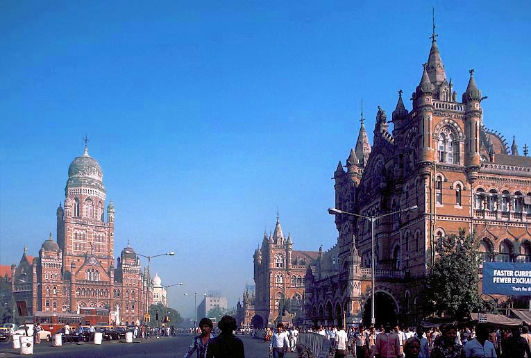 チャトラパティ・シヴァージー駅舎(道路の右側)と行政庁舎(左側) どちらも F・W・スティーヴンスの設計。駅舎が「ゴチック・リバイバル」 であるのに対し、庁舎は「インド・サラセン様式」と折衷されている.
