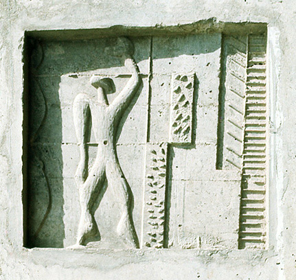 The concrete relief of "Modulor Man" on the wall of the Parliament Building, based on a drawing of Le Corbusier. There are some other concrete reliefs, such as the "Open Hand" in the same building.