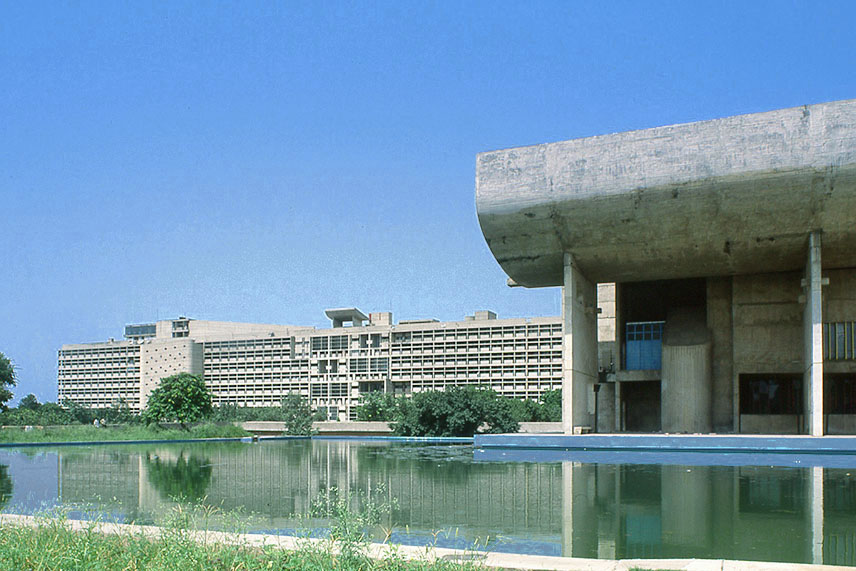 議会棟(パーラメント)から 政庁舎(セクレタリアト)を望む。設計:ル・コルビュジエ 議会棟と高等裁判所の前には それぞれ大きな水面があり、建物が姿を映して 魅惑的な景観をもたらす。政庁舎の前には、なぜ作らなかったのだろうか。