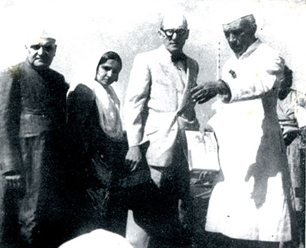 1952年にチャンディーガルの現場を訪れたネルー首相を案内する ル・コルビュジエ(中央) 左はパンジャーブ州知事夫妻(年代順作品集 第5巻 より) (From "Le Corbusier, Oeuvre Complète 1946-52", Zurich)