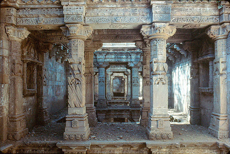 バロット階段井戸、パータン、19世紀初め。 バージェスとクーセンスは、バハードゥル・シング の階段井戸と呼んでいる。 これらの彫刻された柱や梁や腕木は、すべて王妃の階段井戸の上層部を運んできて 組み立てた。