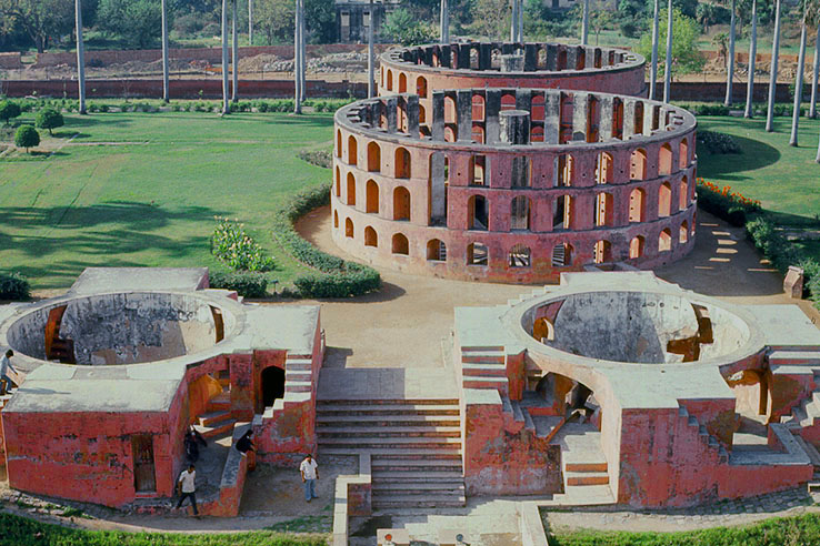 In the forground is a pair of Jai Prakâsh Yantra (Armillary Sphere Instruments)