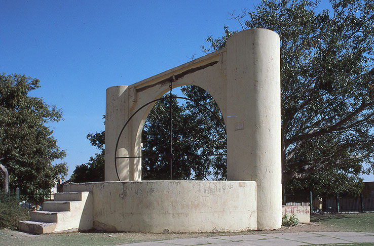 ジャイプルの天文観測所(ジャンタル・マンタル) ウンナタンシャ・ヤントラ Unnatansha Yantra (Altitude Instrument) 目盛りの刻まれた金属製の輪の直径は 約5メートル。 十字の交点の穴にポインターを嵌め、星の高度を測定する。