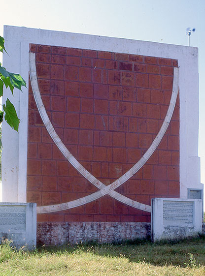 ウジャインの天文観測所(ジャンタル・マンタル) ダクシノ・ヴリッティ・ビッティ・ヤントラ Dakshino Vritti Bhitti Yantra 南北軸の 子午線の壁 Meridian Wall Instrumesnt) の東面(ジャイプルでは 西面)に、交差する二つの大理石の円弧に 目盛りが刻まれている。 円弧の頂部に差し込まれた棒の影が、その時刻の太陽高度を示す。