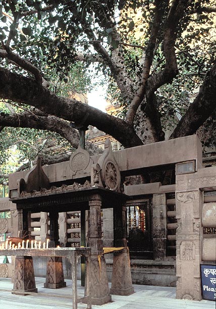 釈迦がその下で悟りを開いたとされる菩提樹(現在のものは二代目)の周囲は、 後に石造の欄楯で囲まれた。 The Bodhi Tree under which Gautama had attained enlightenment was enclosed by stone railings later.d