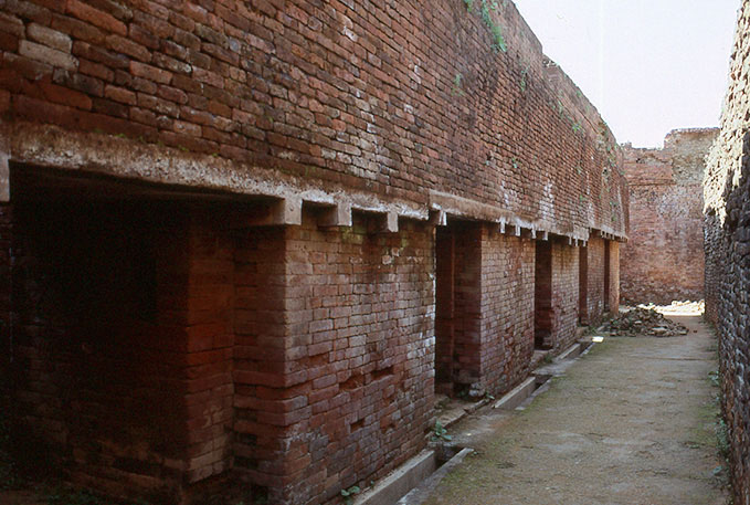 A passage between Monastery-8 and 9 in the Nalanda Mahavihara. The 2nd floor slabs with small joists protrude to the passage, on the edge of which stand heavy brick walls.