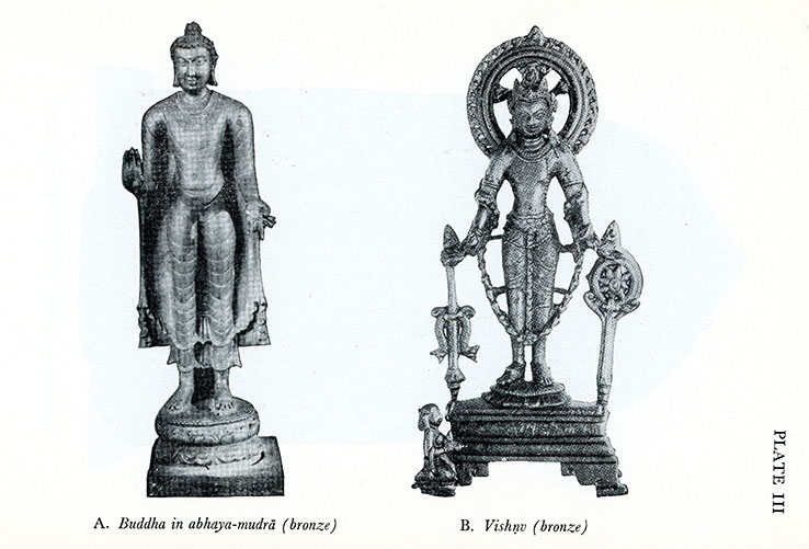 Excavated bronze statues of Buddha and Vishnu at Nalanda, showing the mixture of Maha-yana Buddhism and Hinduism in the Tantric period.