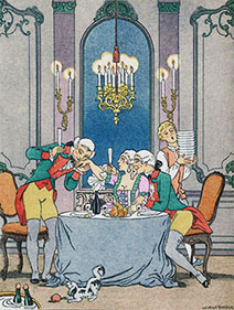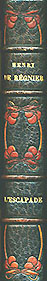 一般的に アールデコの装飾は、少なくとも 古典古代(ギリシア、ローマ)に範を求めないこと、アール・ヌヴォの曲線や植物紋には頼らないこと、逆にジグザグ形と流線形、直線と平滑面と動き(スピード感)、工業生産品のイメージ、第三世界の造形物からの借用、等々が かなり共通に見られる。 挿絵本の世界では、「古書の愉しみ」で何度か紹介した ジョルジュ・バルビエが アールデコを代表する挿絵画家で、彼の評伝のタイトルは、『ジョルジュ・バルビエ、アール・デコの誕生』(GEORGE BARBIER, The Birth of Art Deco, 2008, Marsilio)である。私が所蔵する彼の挿絵本『逃避行』の革製本の背表紙は、アールデコというよりも「アール・ヌヴォ」に近いようだ。