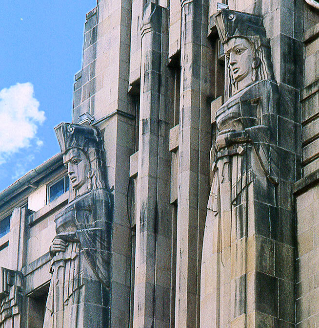 アール・デコの傑作、 新インド保険会社ビル、1936年、ムンバイ 設計は マスター、サテー、ブータの建築家グループ。 ファサードの人体彫刻は N・G・パンサールによる石彫。 アール・ヌヴォの曲線を忌避して 直線を主に使い、顔面でさえも面取りをしてしまう。