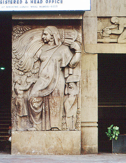 1階入り口右脇のレリーフ彫刻(農耕者)、左脇には 工業者 の像がある。