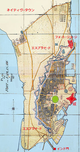 緑の円は ボンベイ・グリーン、後のエルフィンストン・サークル、この東側にあったのが 旧市役所。