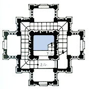 それだけ内部の空間もゆったりし、身を かがめずに登っていくことができる。その登り方が 単純なラセン階段なのではなく、平面的には2枚のロの字型の壁から成っていて、1階分を中央のラセン階段で登ると、次は外周の廊下と階段を登り、次いでまた中央のラセン階段を登るというように、変化に富んでいる。そのことによって一気にラセン階段を登って目が回るということがなく、廊下では神像などの彫刻が眺められ、また個々のラセン階段の上には凝った彫刻天井が見られるのである。塔の建築というものが、これ程までに豊かな造形と空間の可能性を見せてくれる例を、私は他に知らない。