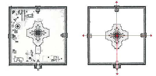 (図面 3) に示すのはアンコール・ワットの第2回廊から内側であって、この外側には 第1回廊がある。第2回廊の規模は約 100m× 120m(*5)であるが、その構成は ジャイナの理想プランと たいへんによく似ている。しかも、アンコール・ワットの中央祠堂もまた 四面堂であった、ということに気がつくのである。つまり、四方に広がる大規模な寺院計画では、その本堂がチャトルムカ的であることが 必然的に要請されてくる。