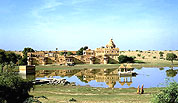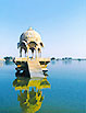 ガディサル湖と、湖中のパビリオン ジャイサルメルの水源は ガディサル湖(タンク)といって、市壁の外にある。これでは外敵に攻められたとき、水源を絶たれてしまいそうであるが、じつはこの町の下にも地下水があり、城下町にも城内町にも 井戸が設けられている(とはいえ、乾季には井戸の水も涸れがちであった)サル湖は ラーオ・ジャイサル王が、城塞とともに 1156年に造営し(窪地をさらに掘り、堤防を造って 雨水を溜めた)、1367年に ガルシ・シング王が再建した。ガディサルの名は「ガルシのサーガル」が縮まったものである。 独立後 インド政府は「ラージャスターン運河プロジェクト」を進め、砂漠を緑化しようとしている。1987年には インディラ・ガンデイー運河が完成した。ジャイサルメルには 1965年以来、15キロ先のダーバラ村から 飲み水が引かれているが、今でも毎日 女達が頭に金色の瓶を乗せて、ガディサル湖に水を汲みに来る。1993年からは 40キロ先のデーハ村から水道が引かれたので、この湖は 乾季にも涸れることがなくなった。