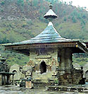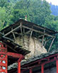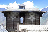 ヒマラヤ地方には雨や雪が多く 木材が豊富であるので、建物が原則として木造であり、勾配屋根が架けられてきたのは 日本と同じである。屋根材には、これもまた豊富に産出する片岩のスレートが 瓦のように用いられてきた。そしてまた多雨地域では 庇で保護されていないと壁が傷むのは 石造も例外ではない。 こうして石と木とが結合されるようになると、もっと積極的に混用されるようになる。 ハトコティのシヴァ寺院では すでに菅笠型をこえて、初めから 聖室を石造とし、屋根を木造とする設計であったように見える。その深い軒の出と反りをもった屋根造形は 魅力的である。一方、バラッグのシヴァ寺院では、菅笠のついた石造のシカラの手前に 木造のマンダパが増築されて、ユニークな構成をしている。