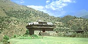 ヒマラヤ地方では 地震が少なくないので、建物には 耐震性をもたせなければならない。その意味もあって、この地方では石造と木造が 意外な形で融合することとなった。それは 木材を水平材として用い、石と交互に積んで壁をつくるのである。コンクリートの中に鉄筋をいれて補強するように、木の横材と石とを組み合わせることによって、単なる組積造よりも ずっと強度の高い壁面を得ることができる。