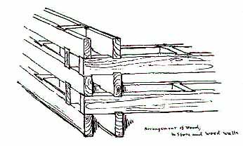 ![]() W・シンプスンによる木の枠組みのスケッチ 上図の ウィリアム・シンプスンのスケッチが示すように、まず木を井桁のように組み、その中に石材を詰めていく。コーナー部では木が重なり合うために、遠目には柱のように見えるが、実際には 垂直材は無い。ナガルの領主の館が 今はホテルになっているが、これは その古い実例である。その後この形式は 民家から城塞、そして寺院塔へと 広く利用されるようになり、そのストライプ状の壁面が ヒマーチャル地方の建物の基本的な要素となった。その高層化した寺院塔の実例は、回を改めて紹介する予定である。