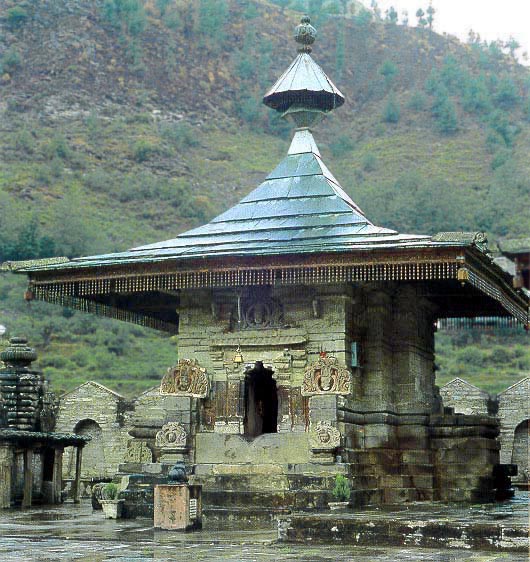 ハトコティのシヴァ寺院は、石造の聖室の上に 木造の大屋根を架ける。